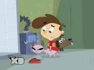 Growler is the dog of Old Lady Munson, who had him since he was a puppy, as seen in Let The Games Begin, Search and De-Toy, When Bad Dogs Go Big in Burt's flashback of when he was Coop age. Growler is a secondary character, although he is seen more than the other secondary characters. Growler may look scrawny and daft, but he is pretty tough. This is seen in the title sequence when he yowls (barking, howling and growling) at Coop & Kat. This is probably because he has always lived with the extremely nasty Old Lady Munson who probably taught him all he knows on misery, pain, wimps, boys and Captain Blasteroid, Old Lady Munson's nephew, as seen in Outer Space Case when Coop, Fiona and Dennis become curious about Old Lady Munson's little guest. Growler is a good name for a dog that growls because his name starts with a growl and is a guard dog to Old Lady Munson. She barks a lot of time.