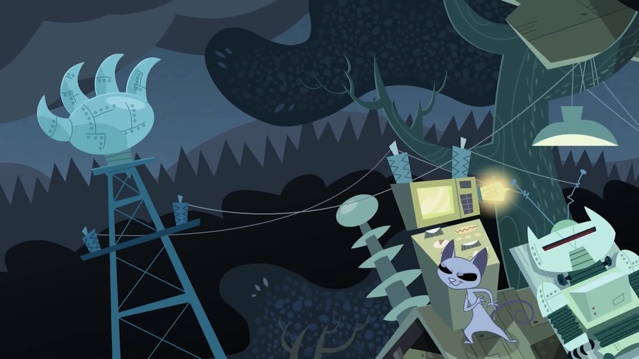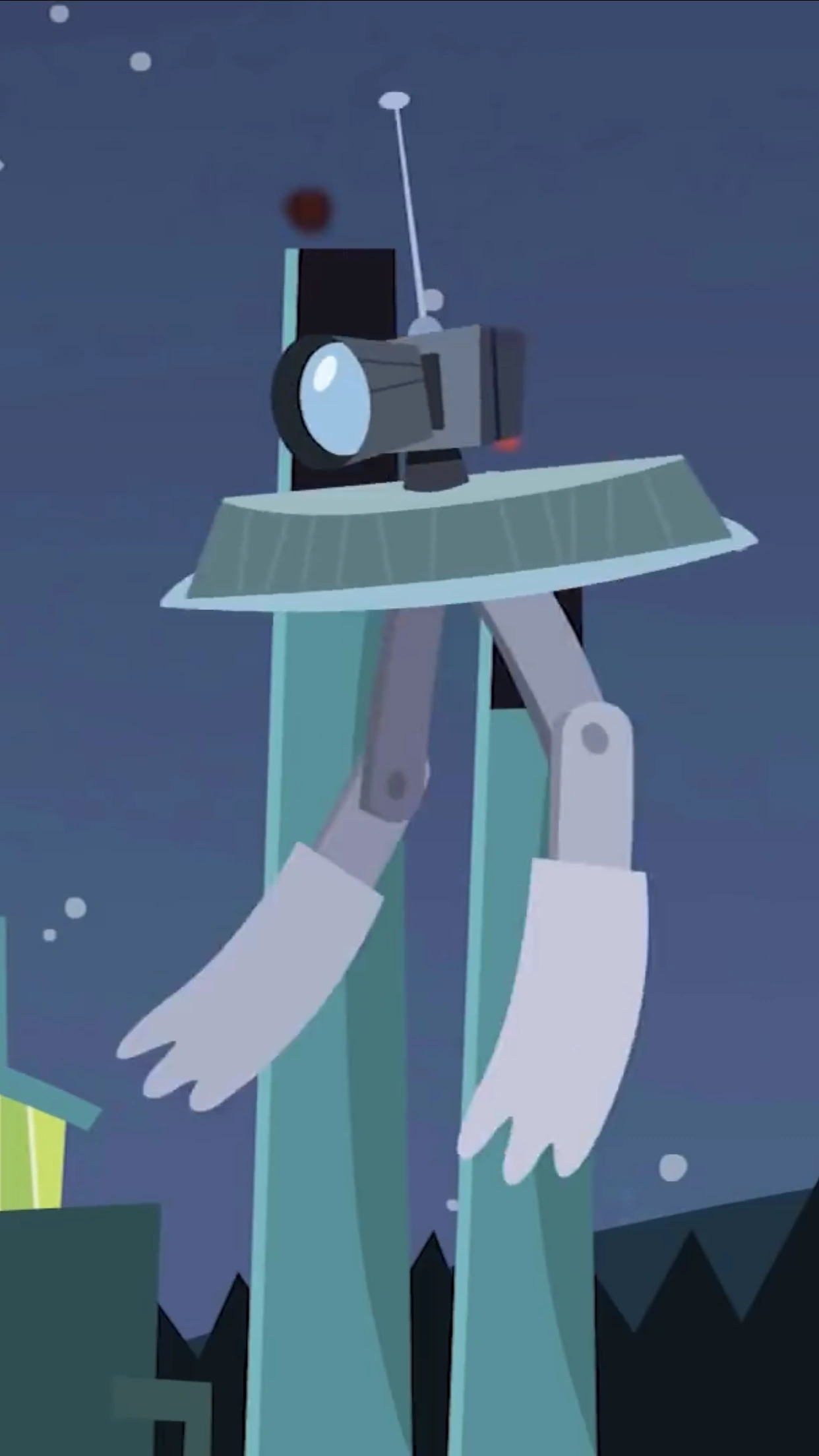 This appears in Tom-Kat Foolery and Over the Radar. Kat made millions of robots to use to prank everyone in Bootsville on April Fool's Day, It made out of pie dishes he stole from Old Lady Munson's house, minicams and metal arms too. Kat plays Coop's voice on them using a photo of him.